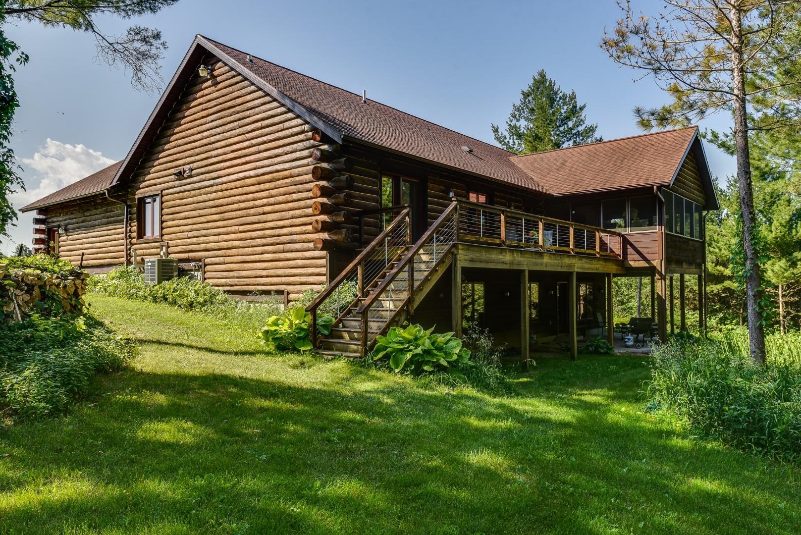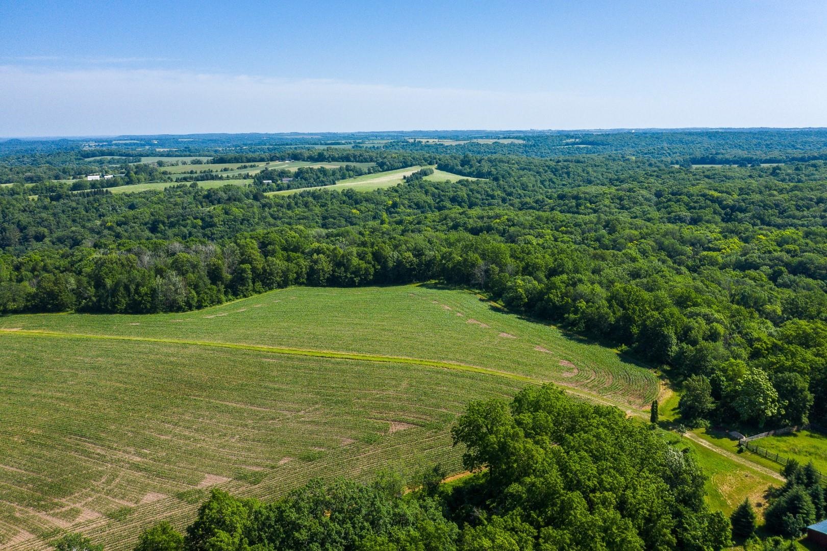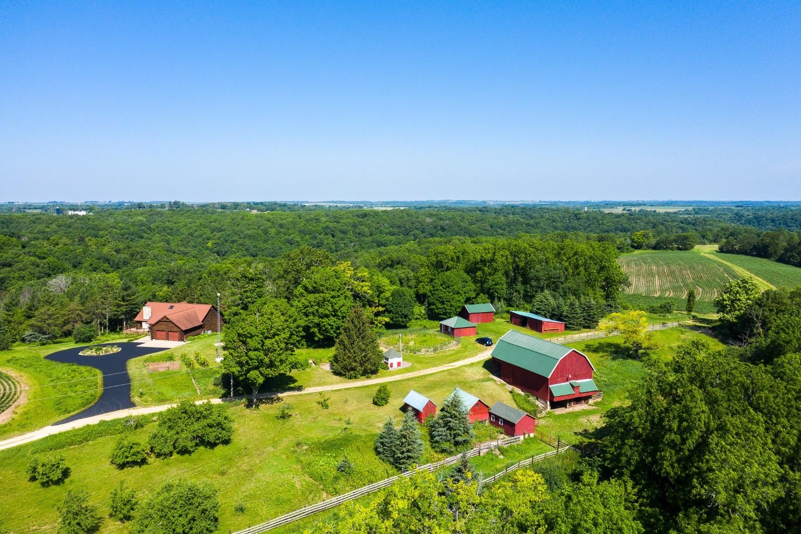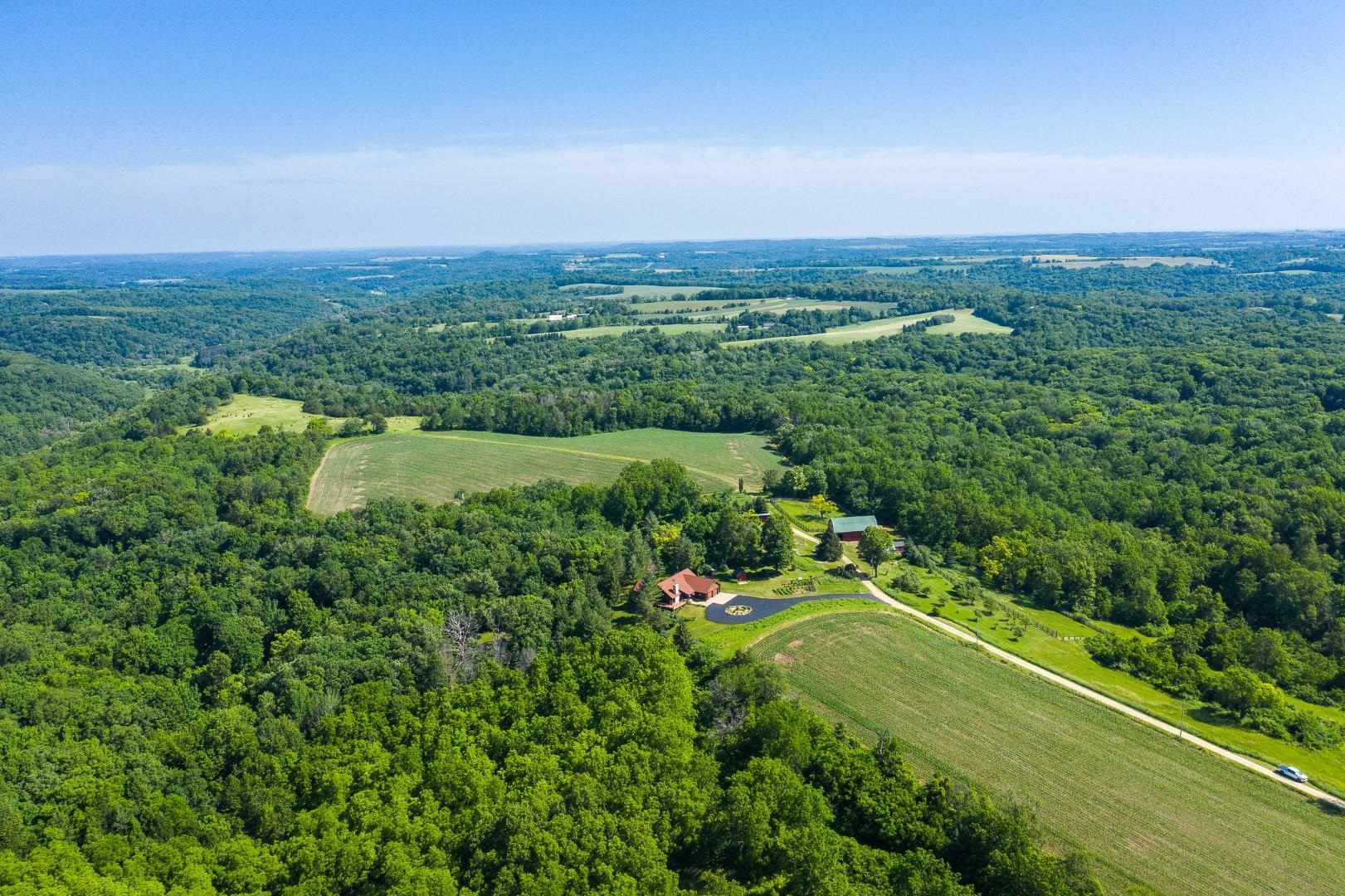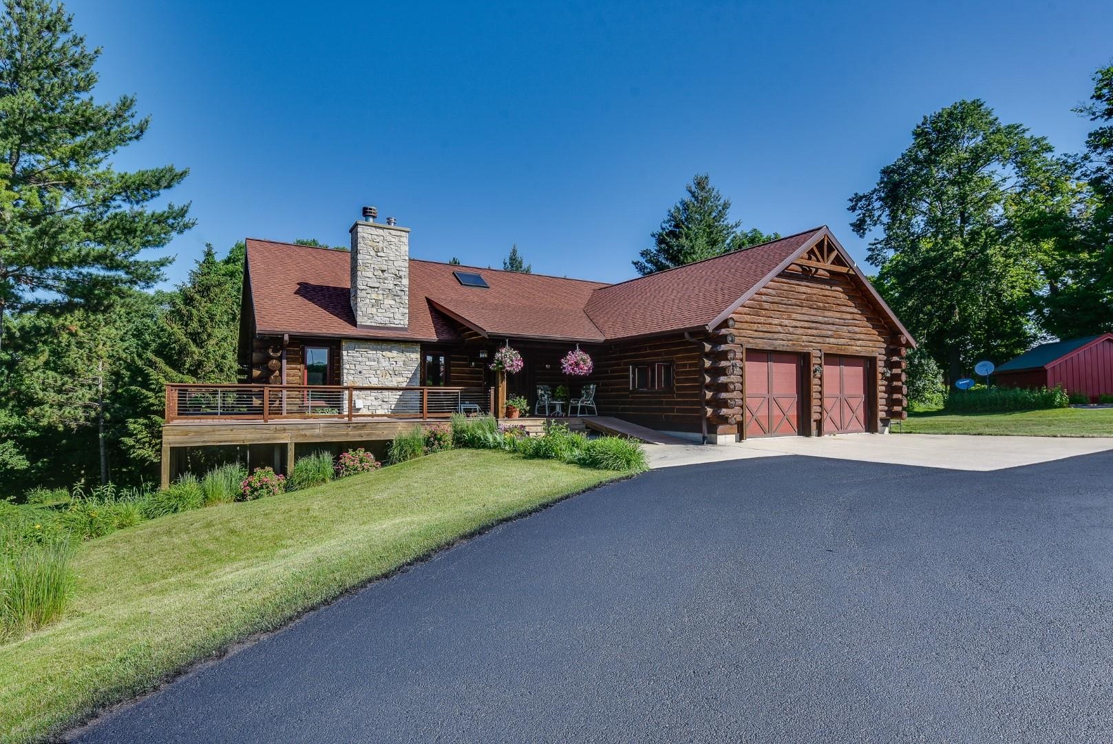 Your own private oasis! Stunning log home on just over 90 ac. Beautiful limestone wood burning fireplace on the main level, open floor plan w/ vaulted ceiling & large windows. Large kitchen w/high quality stainless, pantry & center island. Main level primary suite w/ 2 walk-in closets. Main level laundry. Great details built-in throughout including bookshelves & storage, desk in the office, closet systems, spice drawer in kitchen, epoxied garage, radiant floor heat in walkout level. Amazing 19x13 screened porch. 54 ac in MFL, 25 ac of tillable, over 5 ac of trails, rock outcroppings, creek, apple & pear trees, several well-maintained outbuildings including a great barn w/ metal roof. Excellent hunting and wildlife watching.