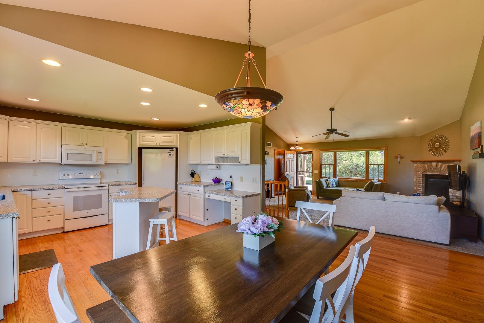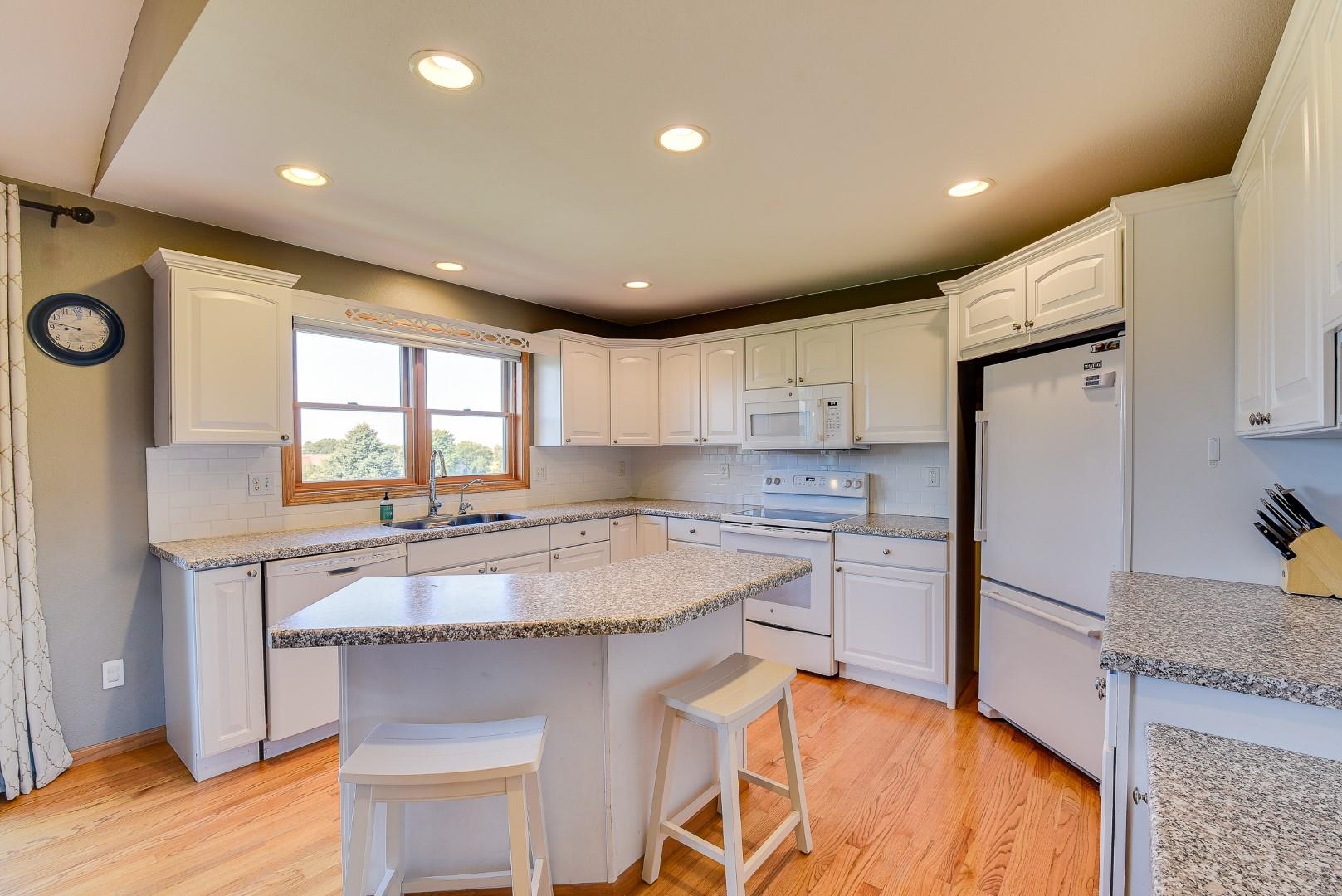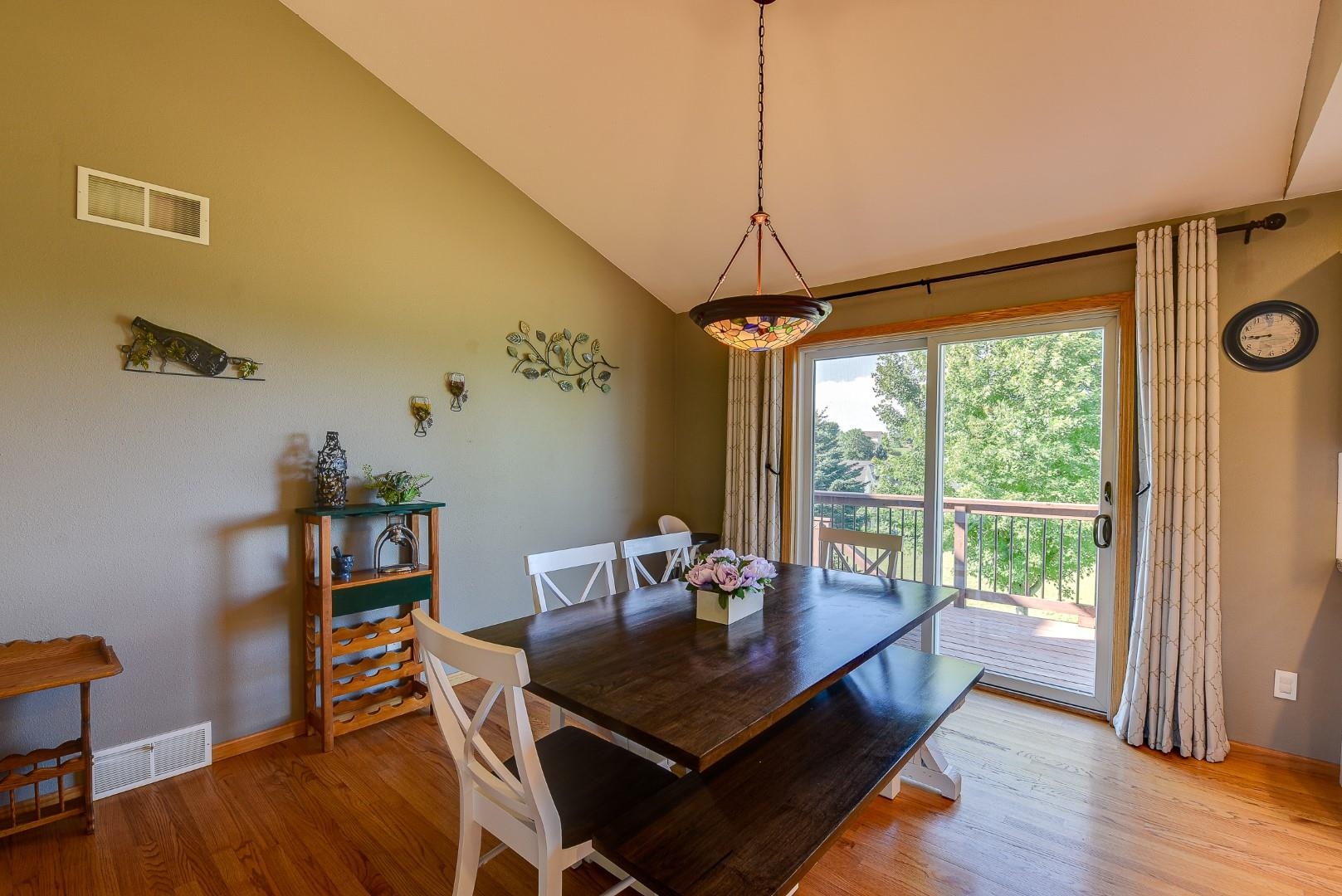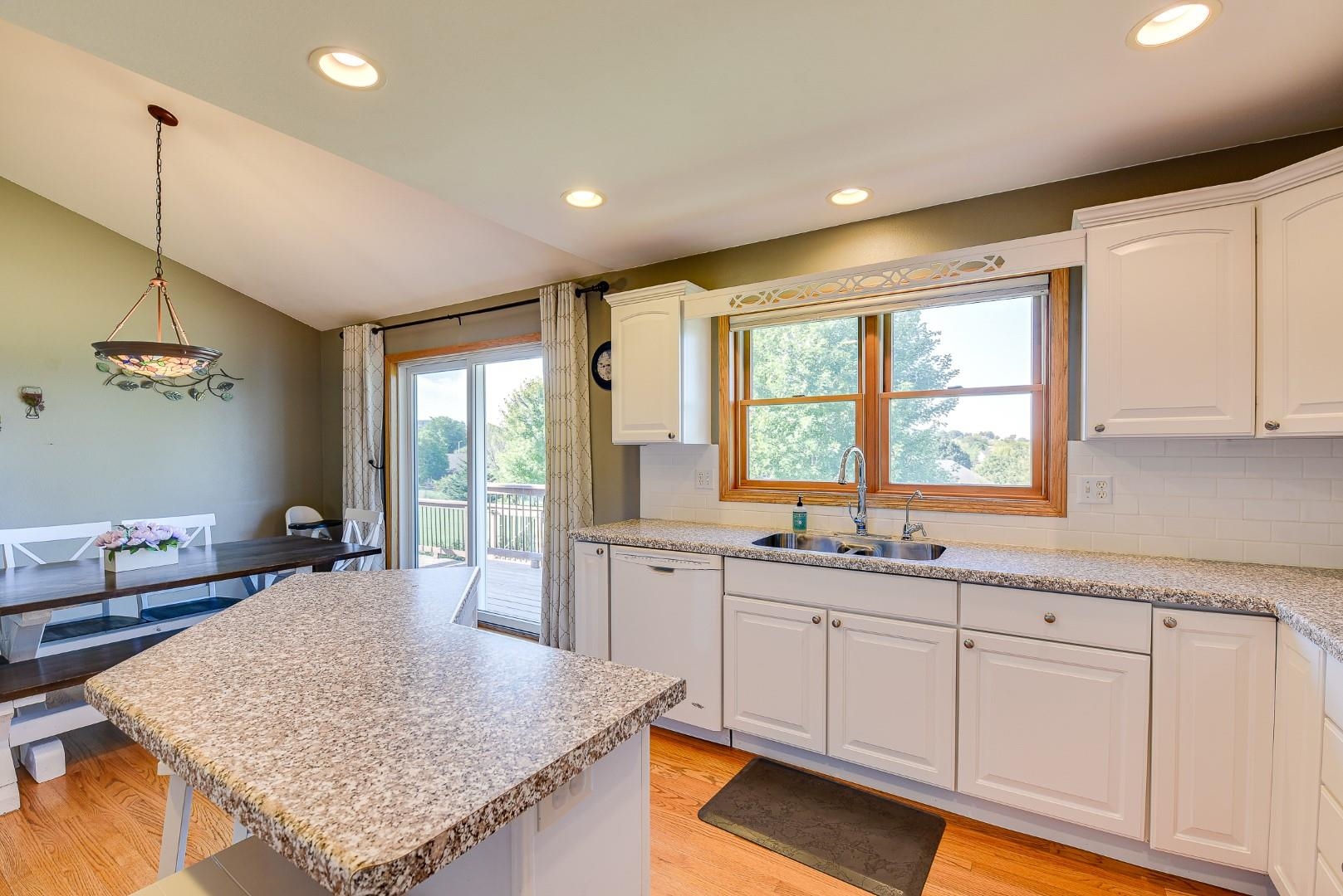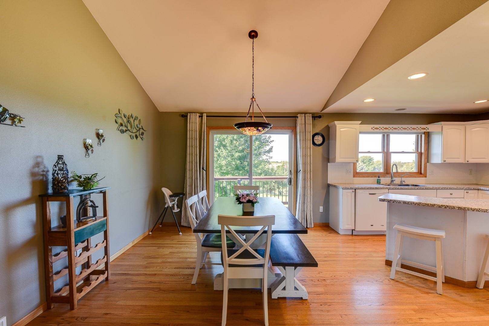 Welcome home! Fall in love with this 4 bedroom, 3 bath ranch home featuring a spacious open floor plan, vaulted ceiling, hardwood flooring in the kitchen & dining area, large bedrooms, main level laundry, walk in pantry, gas fireplace on the main level and gas stove in the walkout LL. Lots of storage and light in this home. Outside there is a beautiful covered porch, deck and a large, flat backyard with great views! Extra garage in the lower level for lawn mowers and/or toys. Desirable neighborhood within walking distance to the schools and easy commute to Lands’ End, Vortex Optics, Duluth Trading and Madison. All measurements are approx. Call for your private showing today!