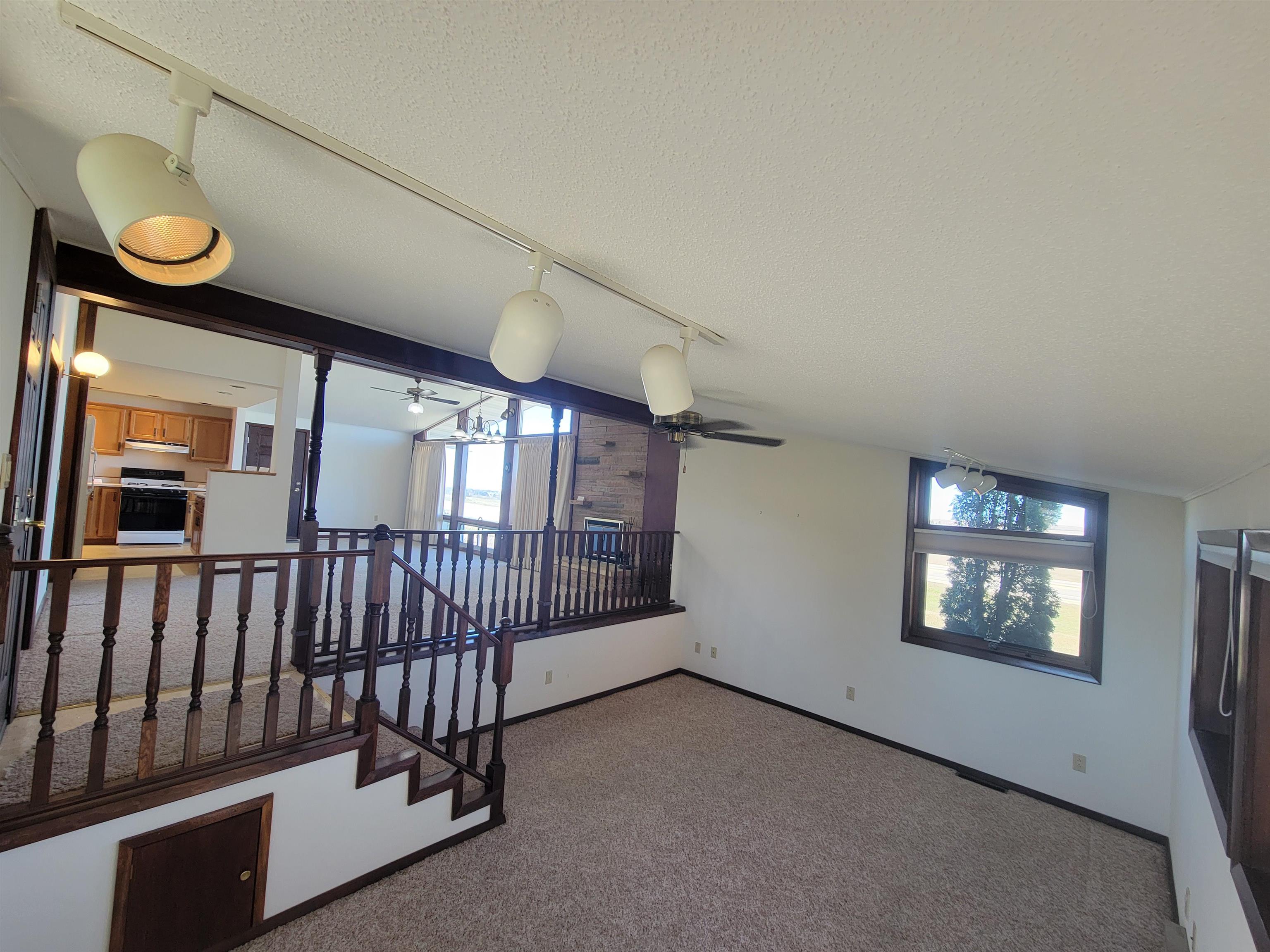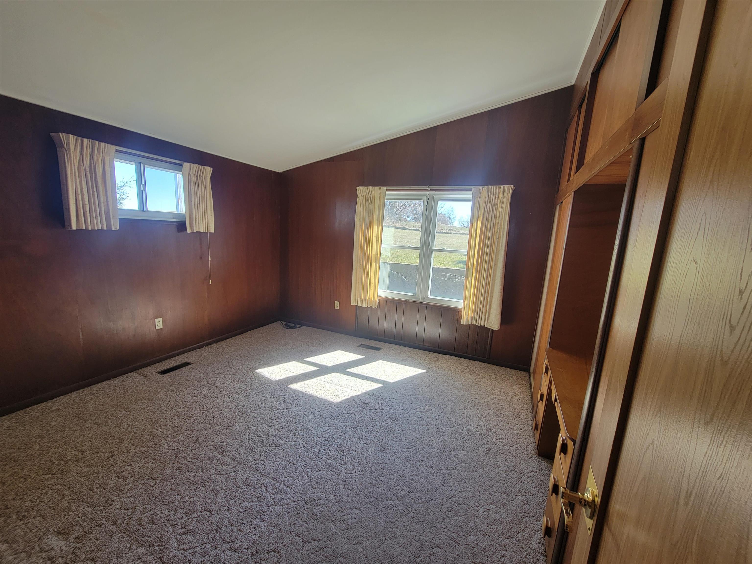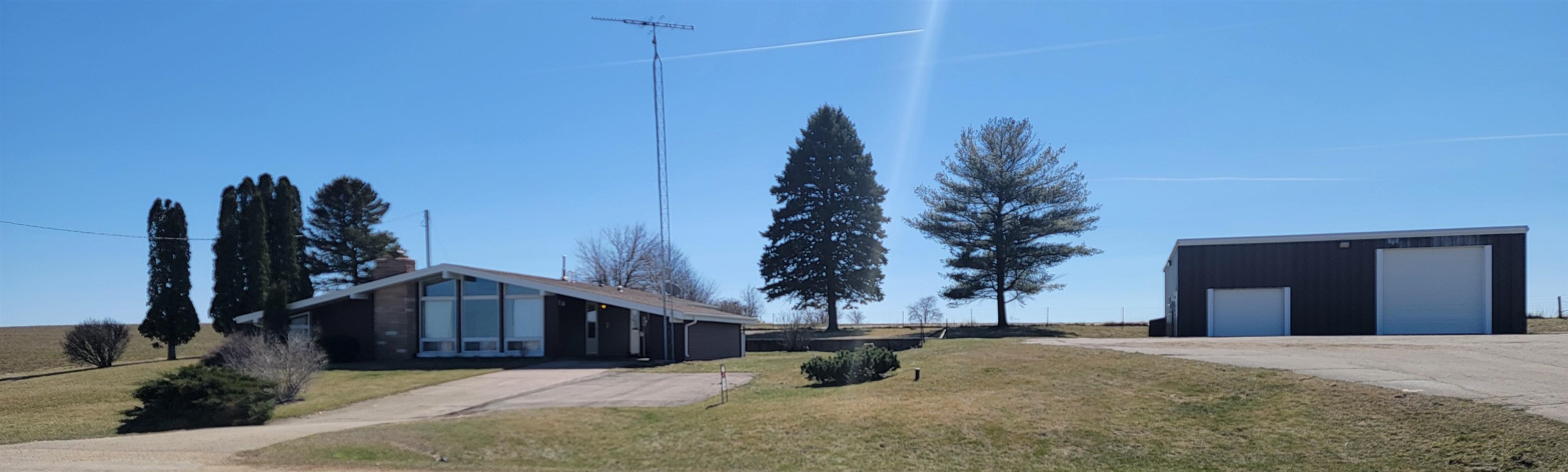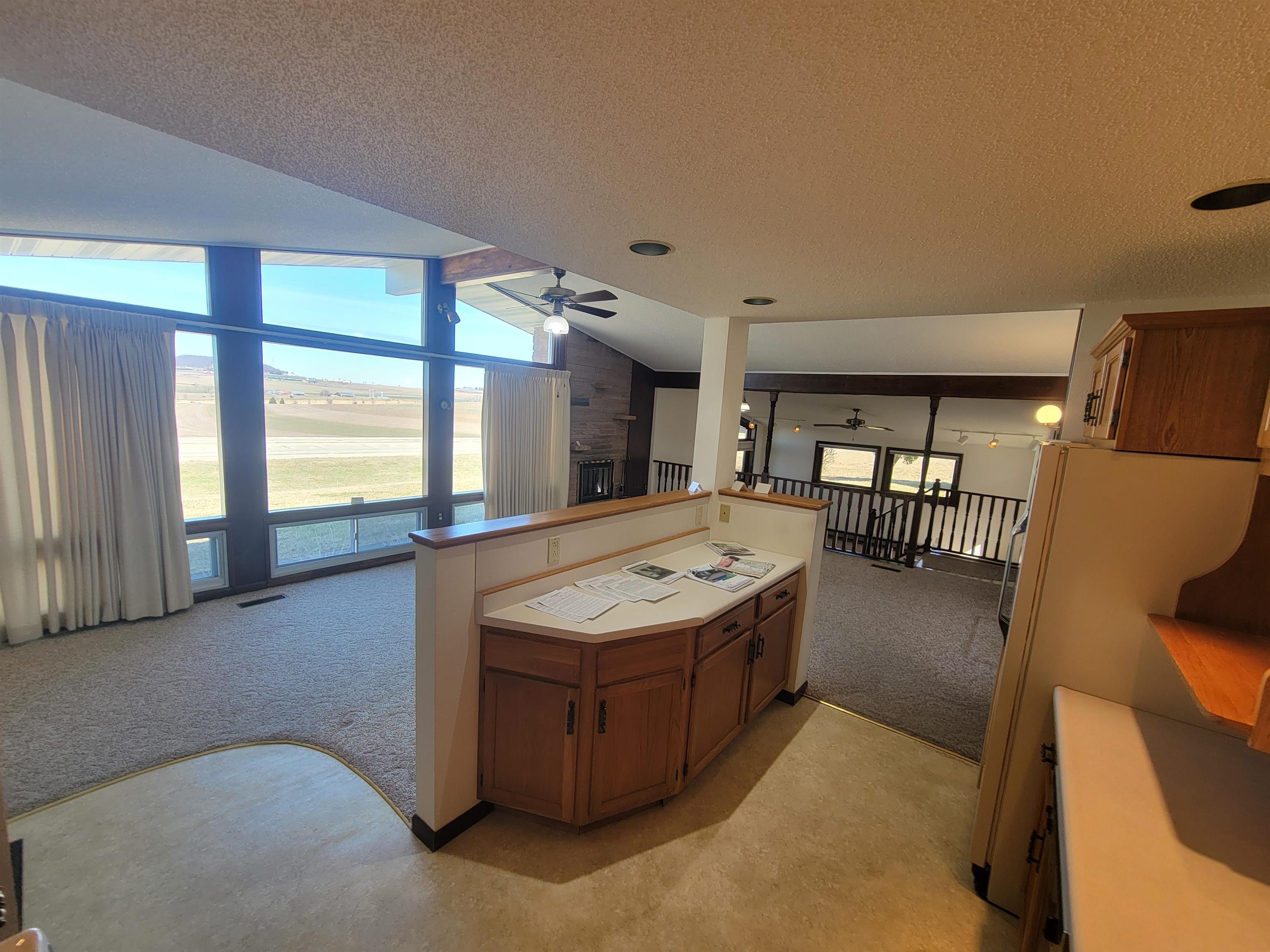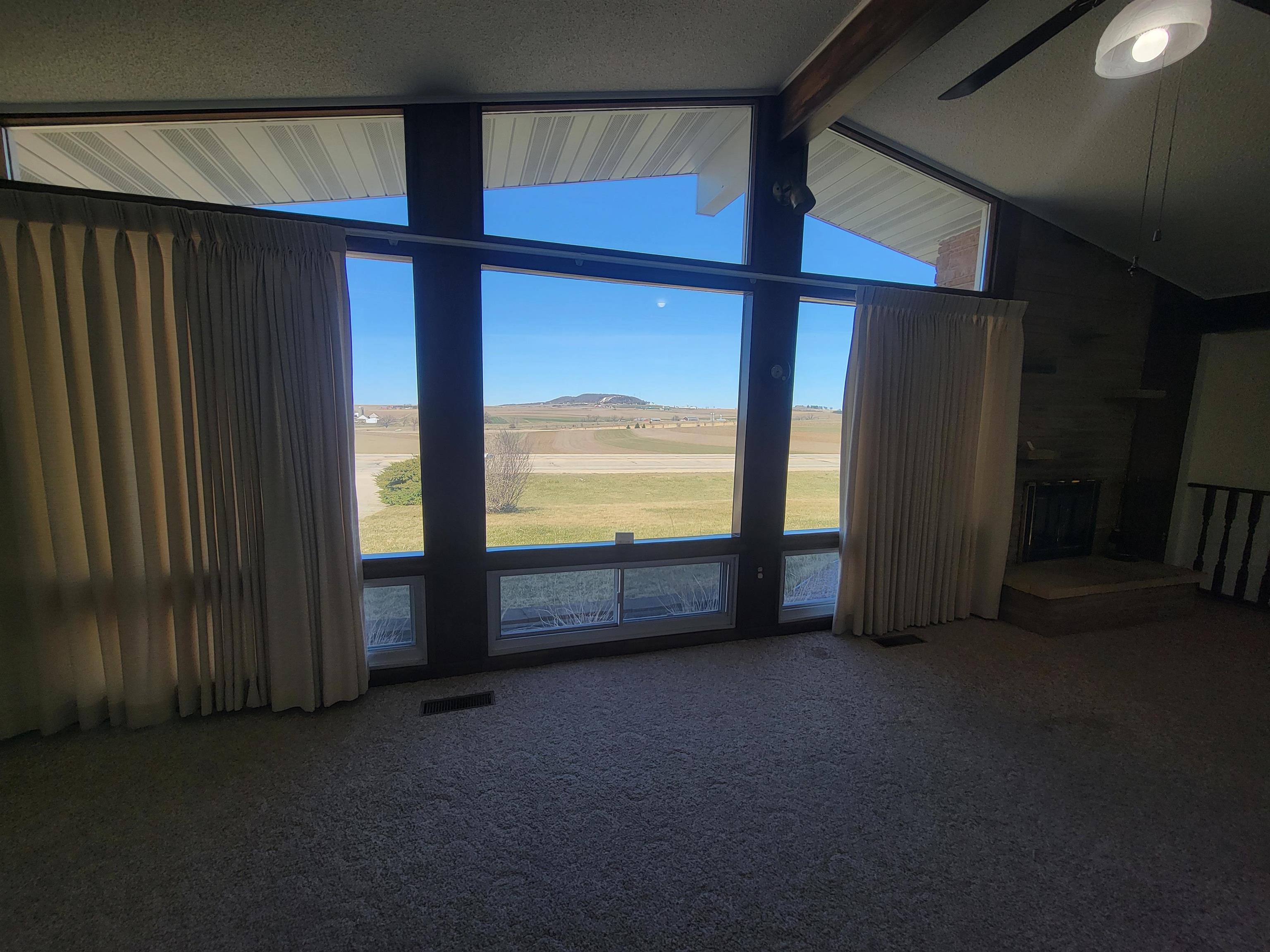 Well located mid century modern ranch home with nice open floor plan with an efficient galley style kitchen and roomy dining and living areas with a wood burning fireplace and three large picture windows with a beautiful view overlooking the "M". Sunken family room with access to a backyard patio. Nice large and level backyard. Primary bedroom includes a built in vanity with a matching closet on each side. Laundry area includes a stack laundry unit. The outside includes an attached carport with built in storage and a huge approximately 38x42 garage with natural gas forced air heat, electrical, and 8 and 12 foot overhead doors. Great location just a mile from Platteville. New water softener, electrical panel and toilet have been installed. Roof has been repaired.