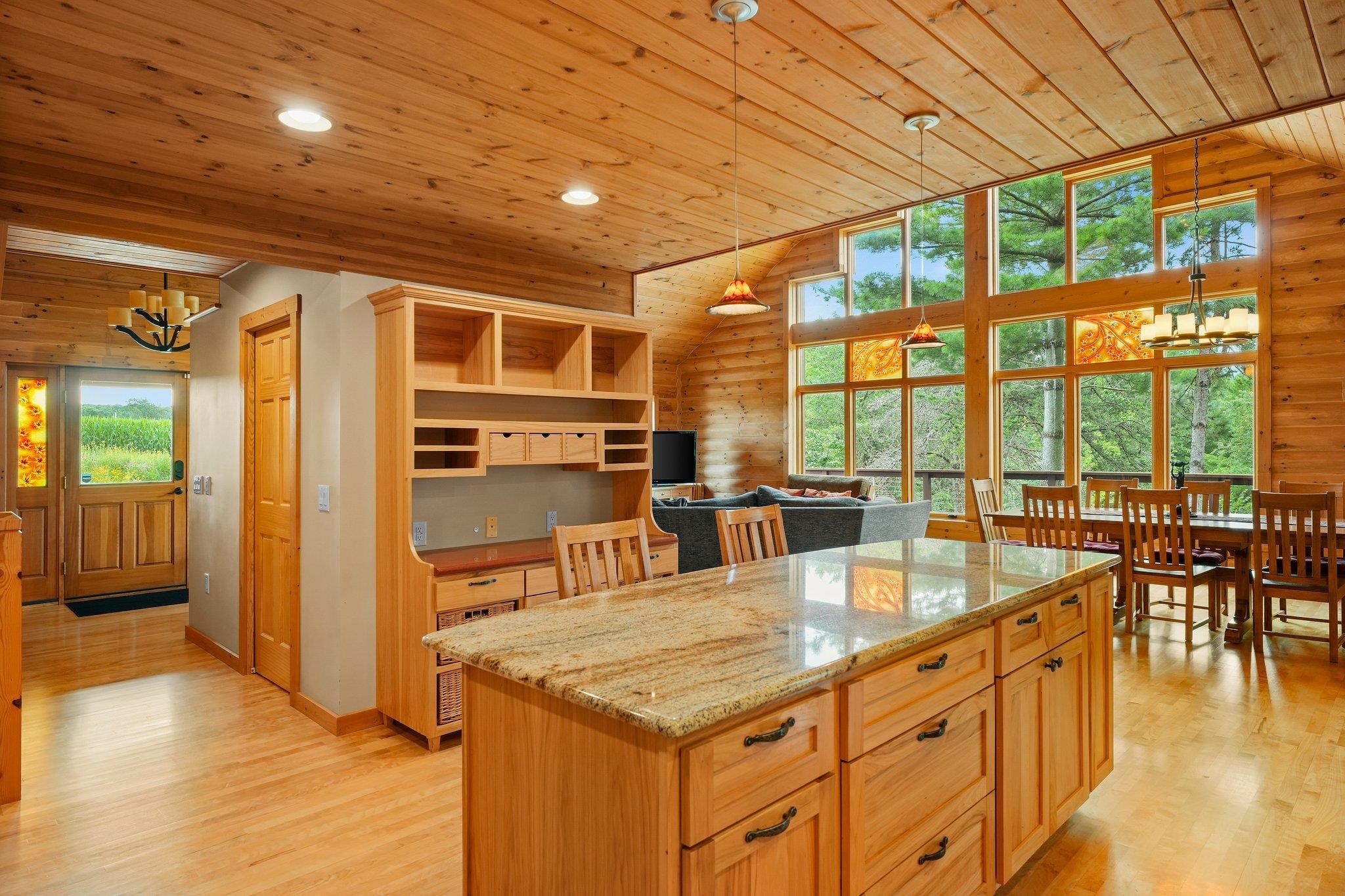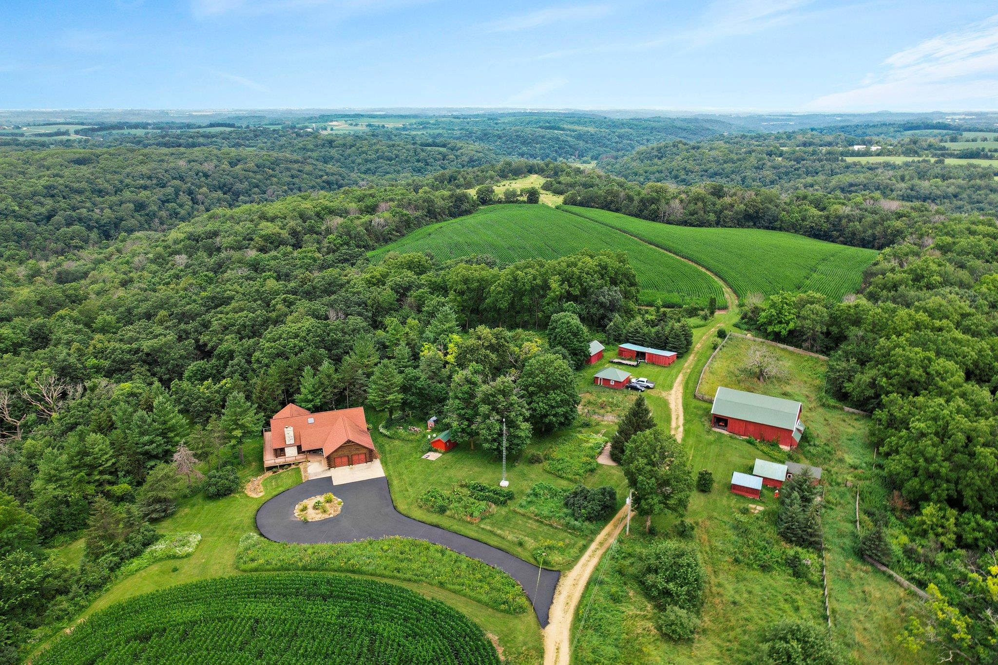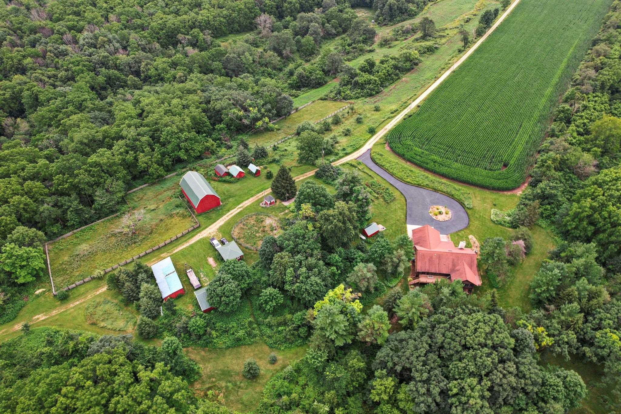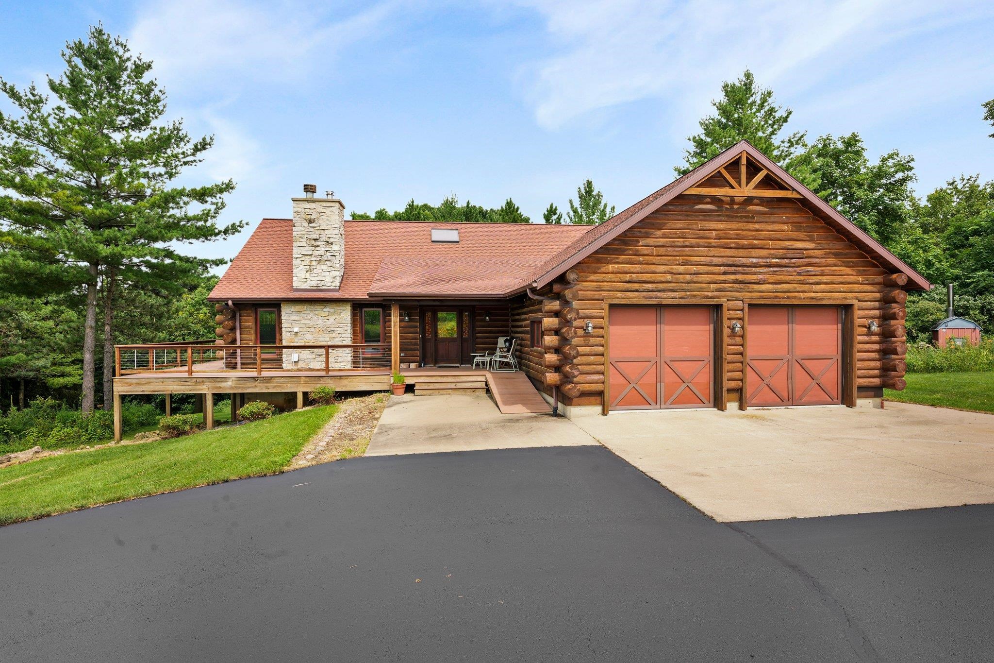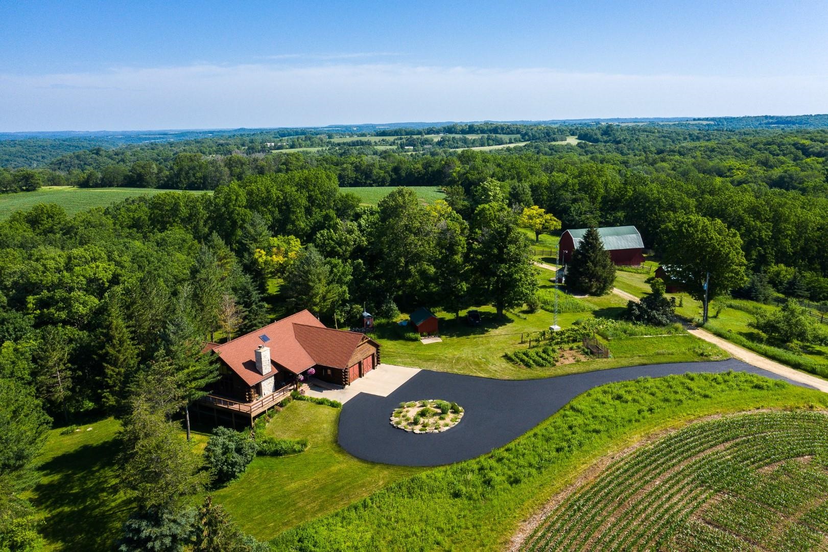 Welcome to your private oasis! Stunning log home is set on over 90 ac. Main level boasts beautiful limestone wood-burning fireplace, open floor plan w/vaulted ceiling & large windows. Spacious kitchen has high-quality stainless appliances, pantry & center island. Main level incl a primary suite w/2 walk-in closets & convenient laundry. Thoughtful details throughout: built-ins like bookshelves, storage, office desk, closet systems, kitchen spice drawer, epoxy-finished garage & radiant flr heating in the walkout level. Enjoy the 19’x13’ screened porch. Property has 40 ac in MFL, 25 tillable ac, over 5 ac of trails, rock outcroppings, creek, apple & pear trees & well-maintained outbuildings & barn w/metal roof. Fenced areas provide flexibility for horses/cattle. Excellent deer hunting.