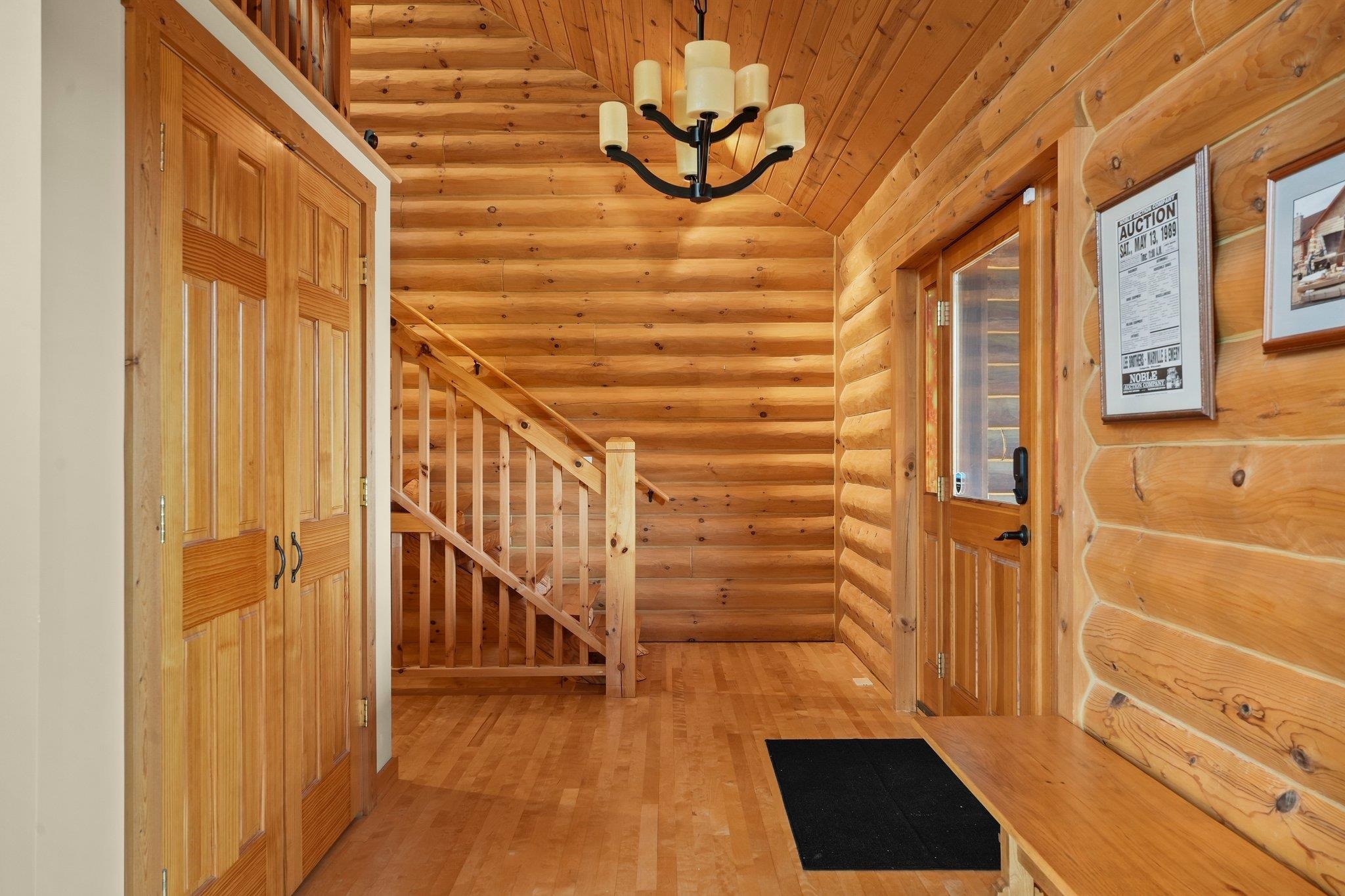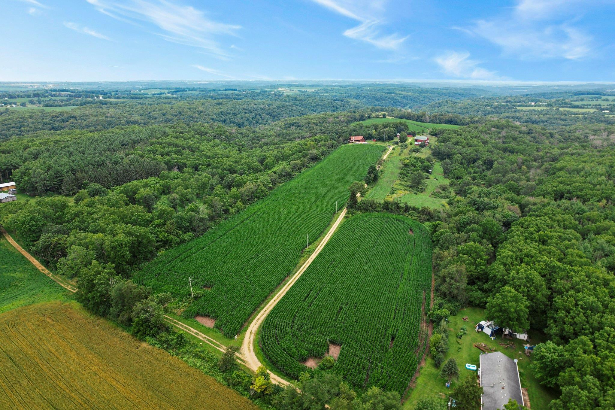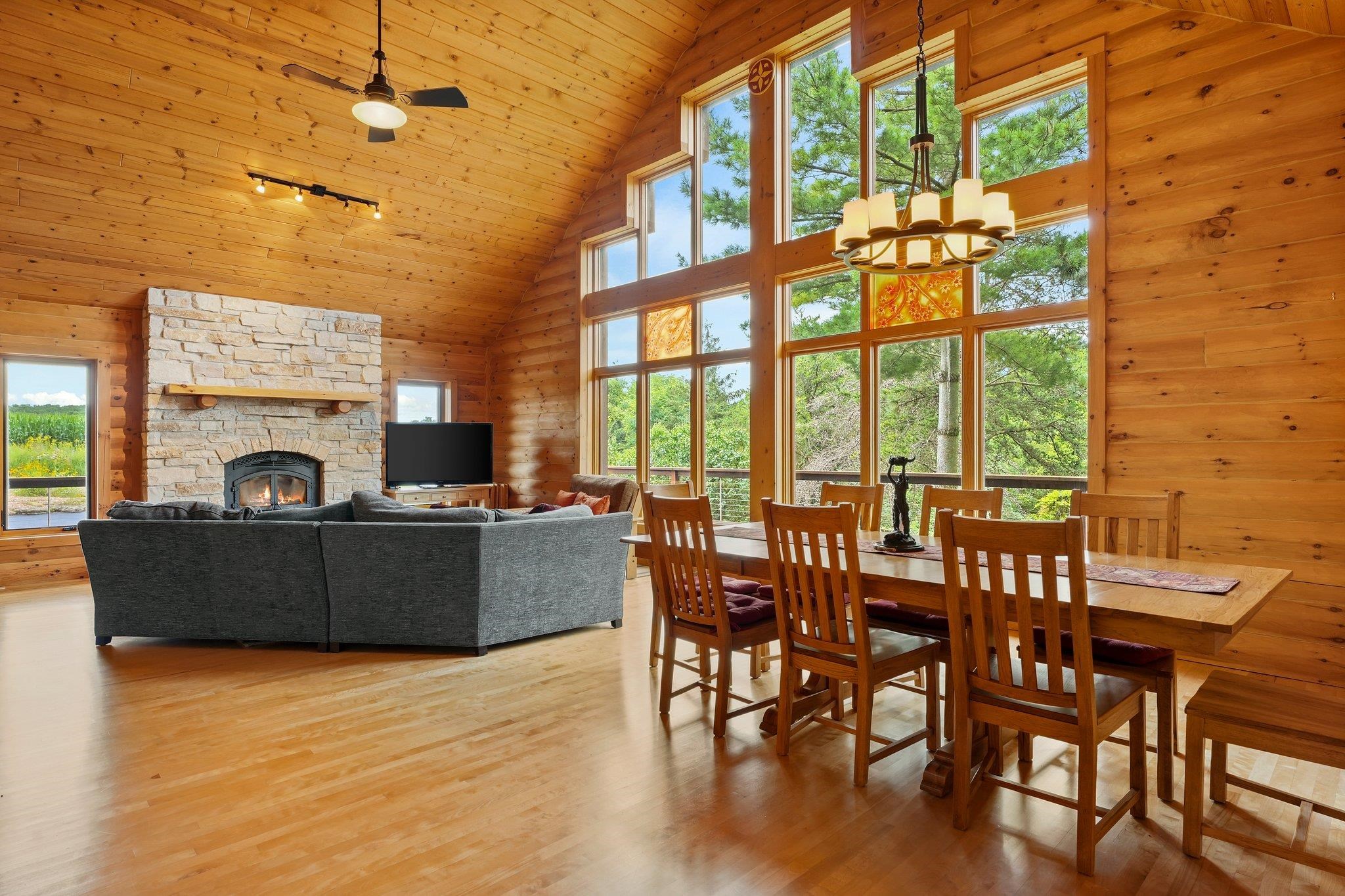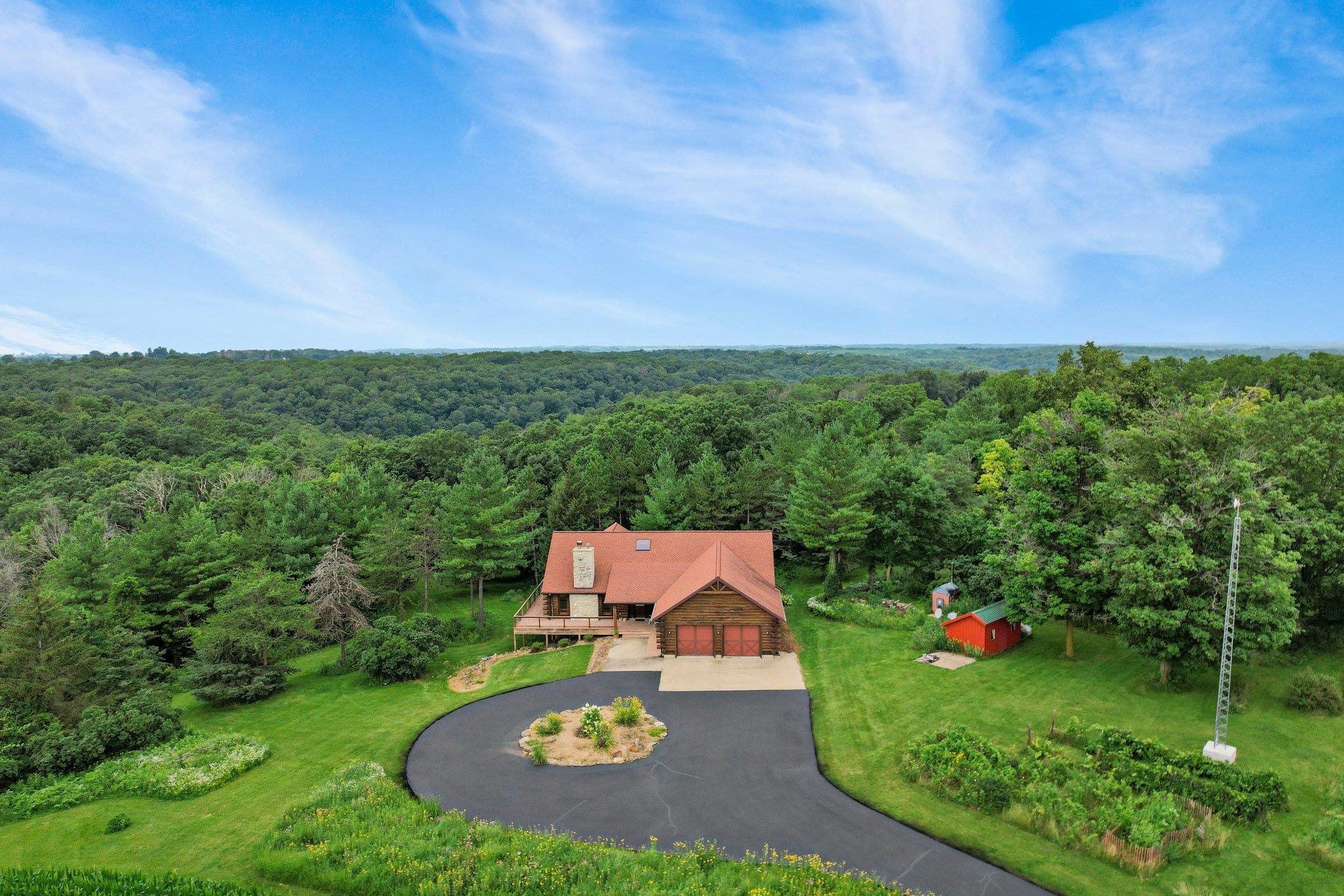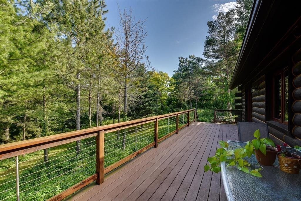 Welcome to your private oasis! Stunning log home is set on over 90 ac. Main level boasts beautiful limestone wood-burning fireplace, open floor plan w/vaulted ceiling & large windows. Spacious kitchen has high-quality stainless appliances, pantry & center island. Main level incl a primary suite w/2 walk-in closets & convenient laundry. Thoughtful details throughout: built-ins like bookshelves, storage, office desk, closet systems, kitchen spice drawer, epoxy-finished garage & radiant flr heating in the walkout level. Enjoy the 19’x13’ screened porch. Property has 40 ac in MFL, 25 tillable ac, over 5 ac of trails, rock outcroppings, creek, apple & pear trees & well-maintained outbuildings & barn w/metal roof. Fenced areas provide flexibility for horses/cattle. Excellent deer hunting.