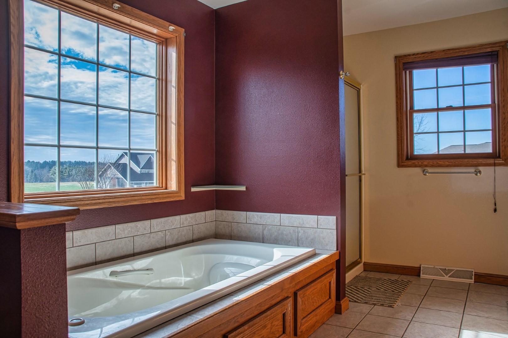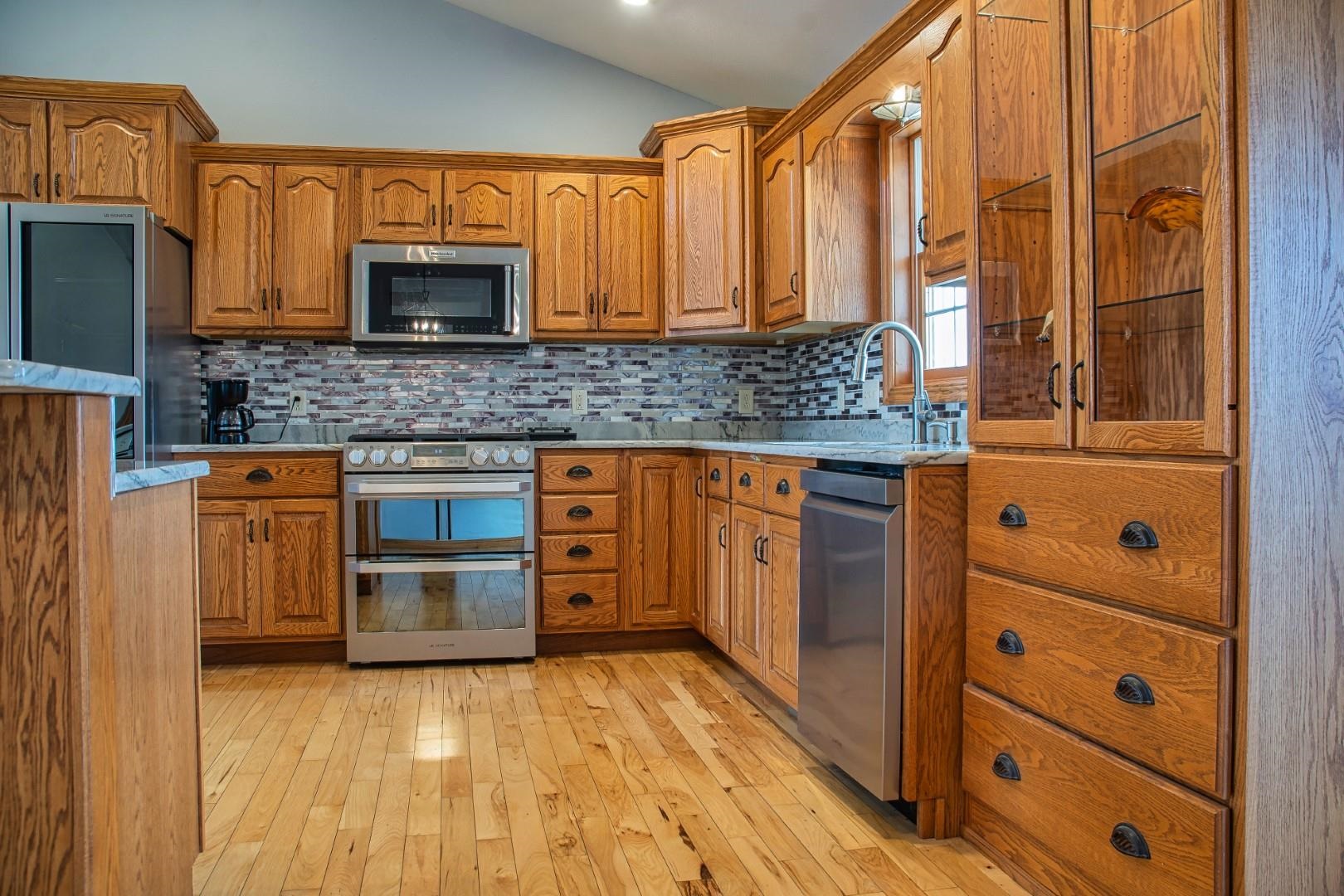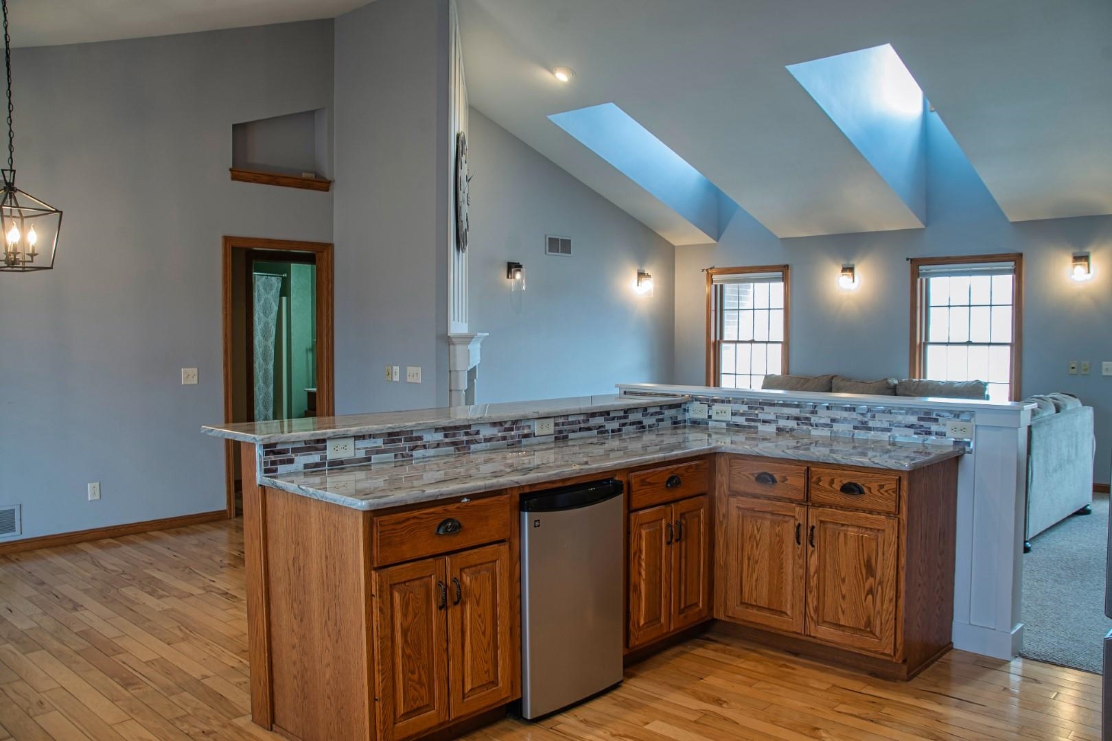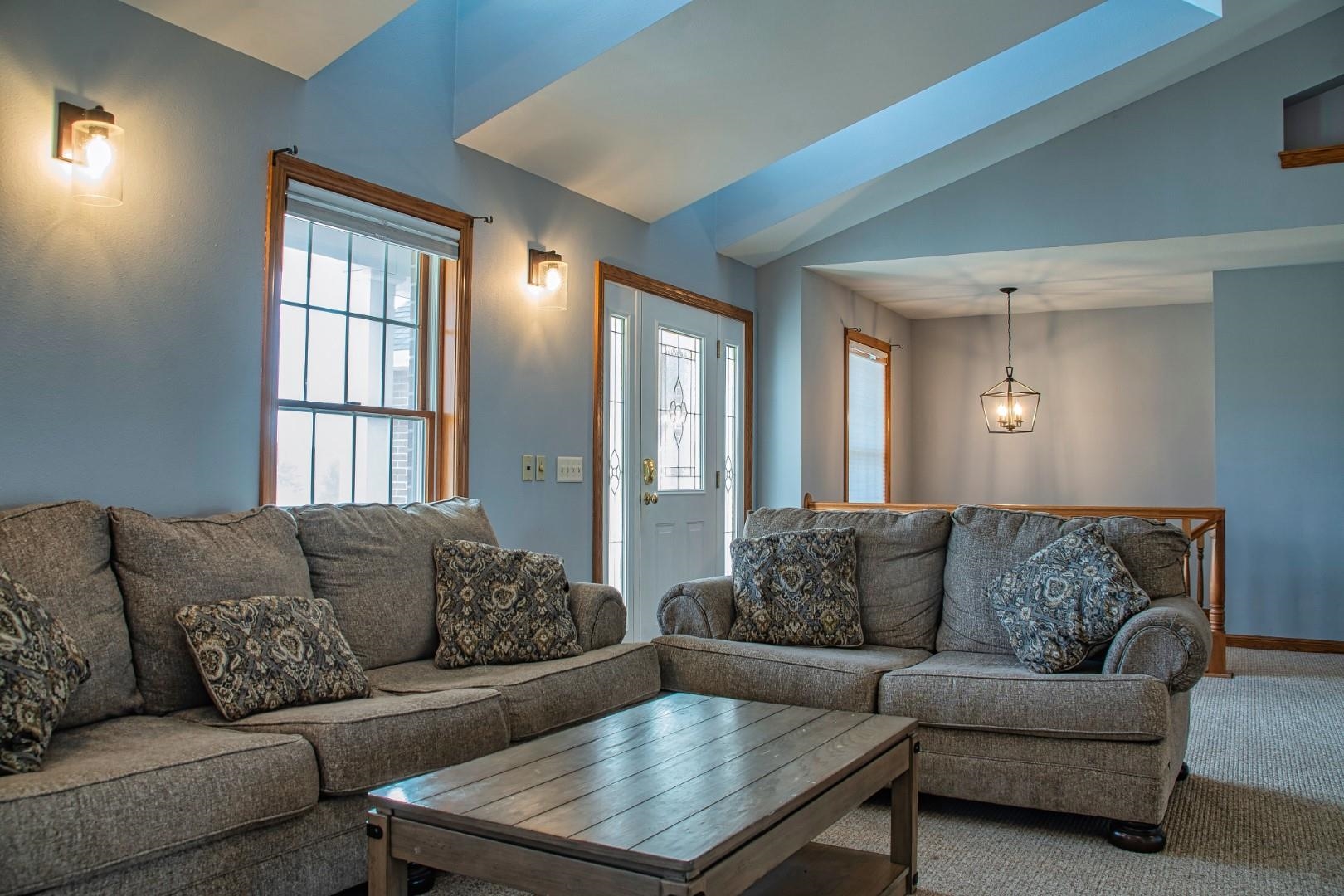 Enter the great room with vaulted ceilings, dormers, and a impressive fireplace open to the kitchen. The large dining area leads to the sun room and deck. The split bedrooms allow for a suite featuring tray ceilings, wood floors, double walk in closets, a bath with double sinks and a jetted tub with separate shower. The additional 2 bedrooms with a full bath with provided privacy. The lower level walkout has a family room full bath and a storage/work area.